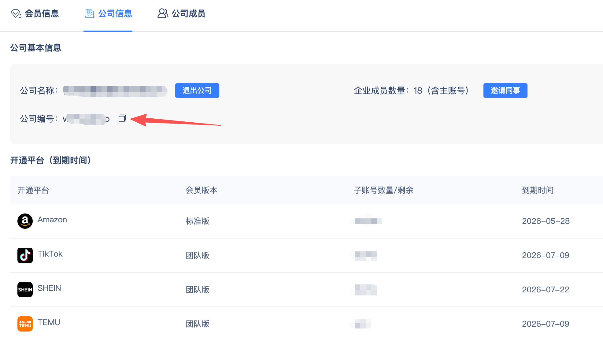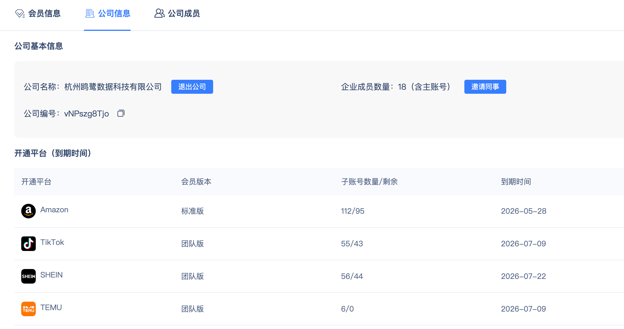 点击公司信息可查看公司的会员信息及权限。