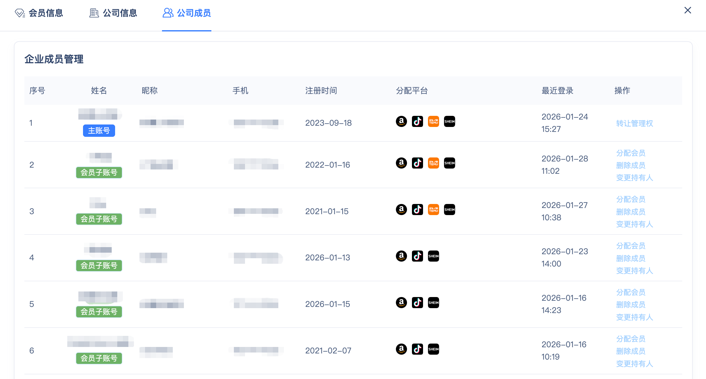 在企业成员管理列表中,找到子账号,可对子账号进行【会员分配】的操作。