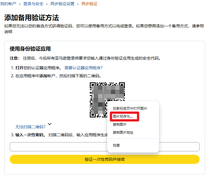 添加新应用程序 -> 进入认证器设置页面后 -> 右键二维码图片 -> 图片另存为 -> 保存至本地(记住保存的位置)