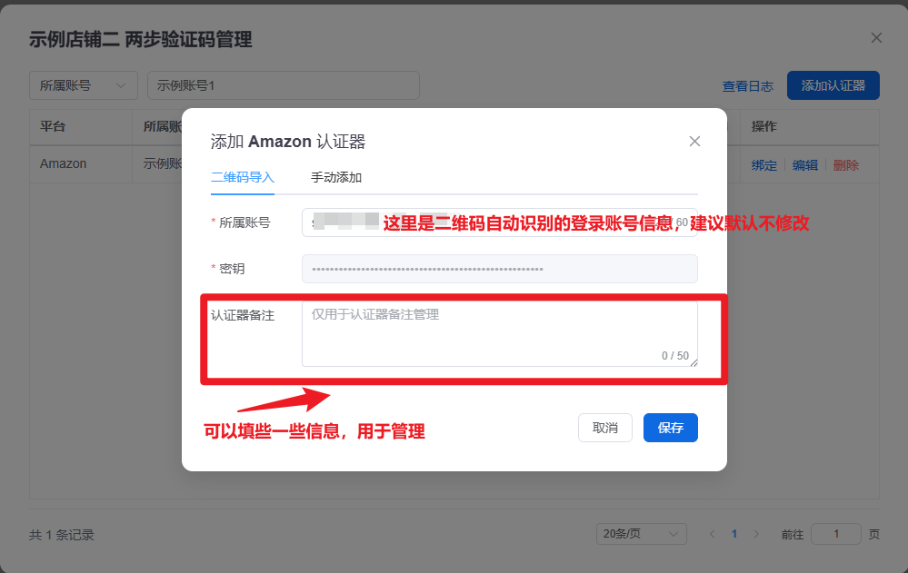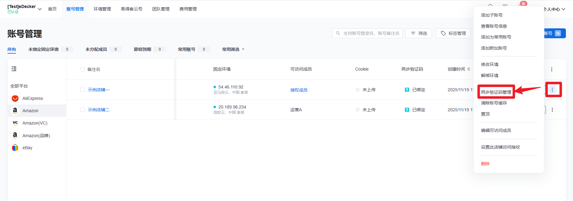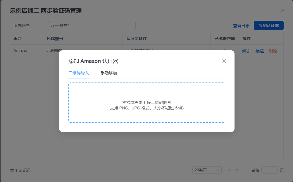 不要关闭亚马逊店铺窗口 ,回到账号管家列表,店铺操作 -> 两步验证码管理 -> 添加认证器