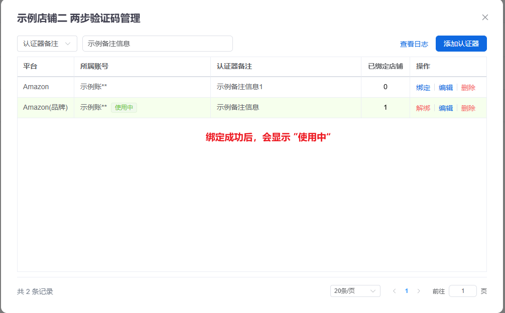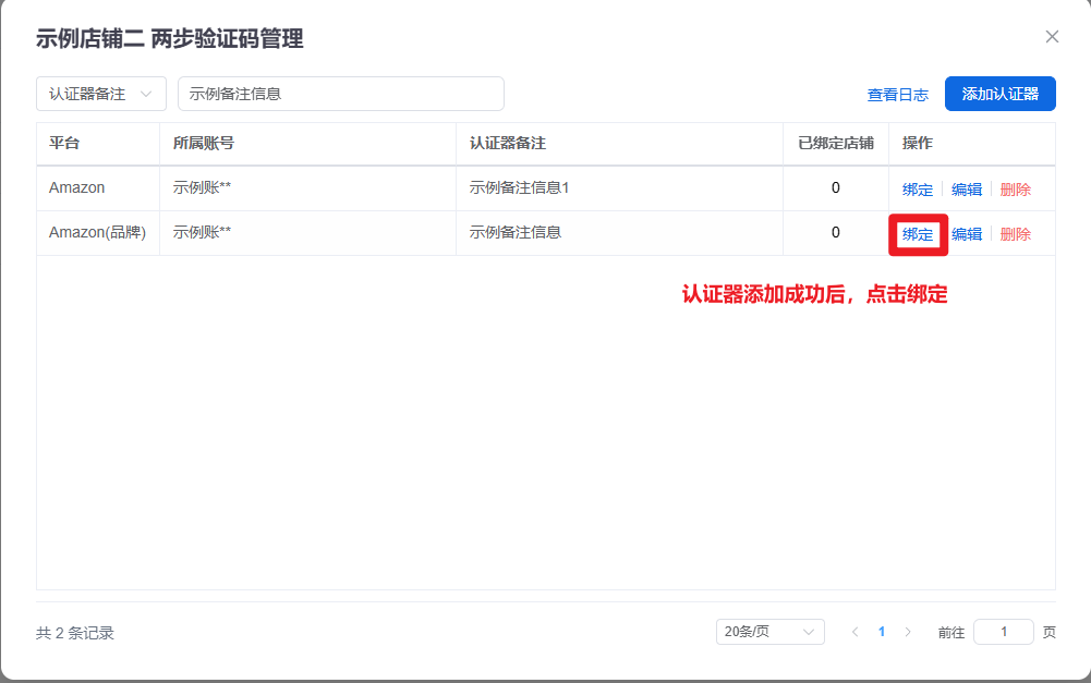 认证器添加成功后,在列表中点击绑定