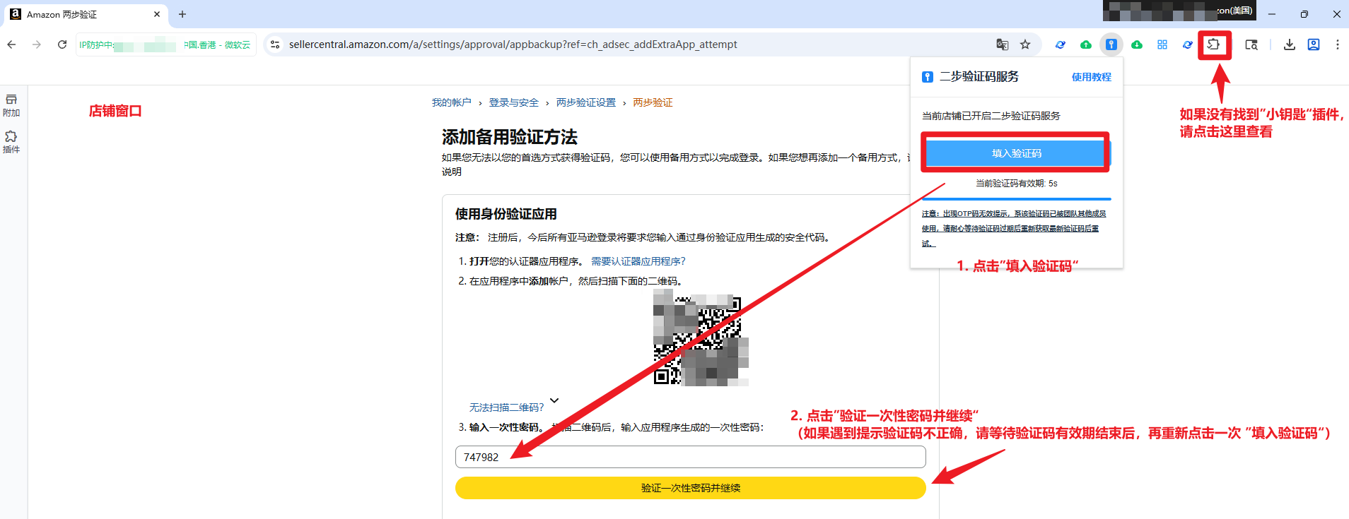 重新回到亚马逊店铺窗口,点击店铺窗口右上角的 ”小钥匙“插件 -> 填入验证码 -> 验证一次性密码并继续